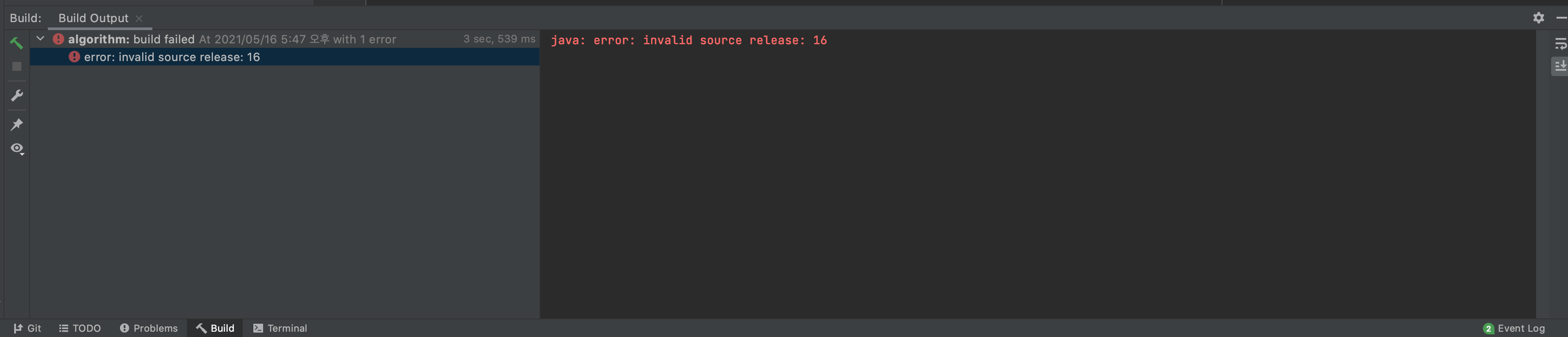 IntellJ에서 프로젝트 들어간 후, Command + ; 버튼을 눌러 자바의 SDK를 다시 설정하여 해결하였다.